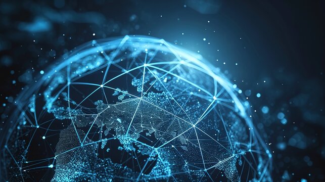 Abstract digital globe with connected lines, represents global business. Glowing energy, futuristic blue tones symbolize worldwide connectivity, information tech, network, finance, corporate