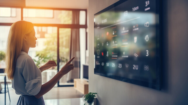 Smart home dashboard interface control connected devices and set up automations. Futuristic virtual screen HUD above digital tablet computer. Assistant technology for smart devices. Smart home concept