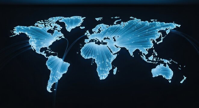 Digital globe showing illuminated continents connected by a web of glowing blue lines and points against a dark starry background, symbolizing global connectivity and data networks