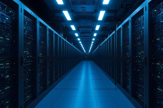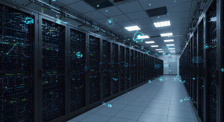 Server Room with Digital Data Flow and Technology Infrastructure Visualizations