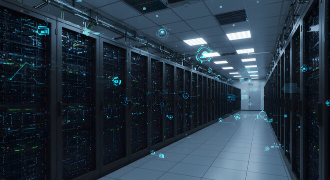 Modern Data Technology Center Server Racks in Dark Room with VFX. Visualization Concept of Internet of Things, Data Flow, Digitalization of Internet Traffic. Complex Electric Equipment Warehouse.