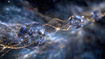 Close-up of planetary alignment represented through symbolic objects, miniature celestial spheres connected by golden threads, deep-space background with nebula colors, soft glow a