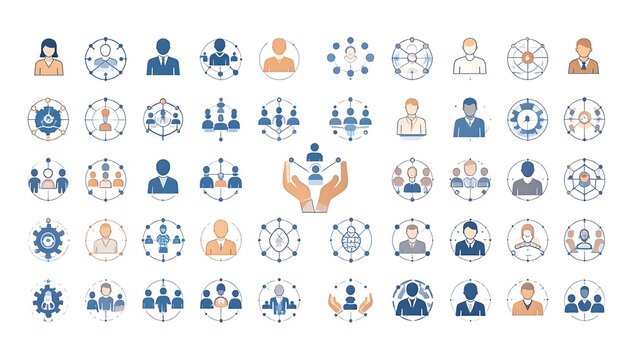 Flat icons depicting various human resources, network, and teamwork concepts.  Diverse people connected by lines and symbols