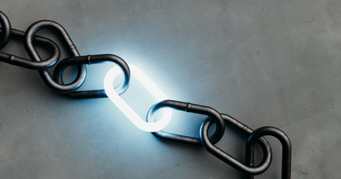 A single illuminated link shining in a dark metal chain on a concrete background, a symbol of power and connection.3d rendering