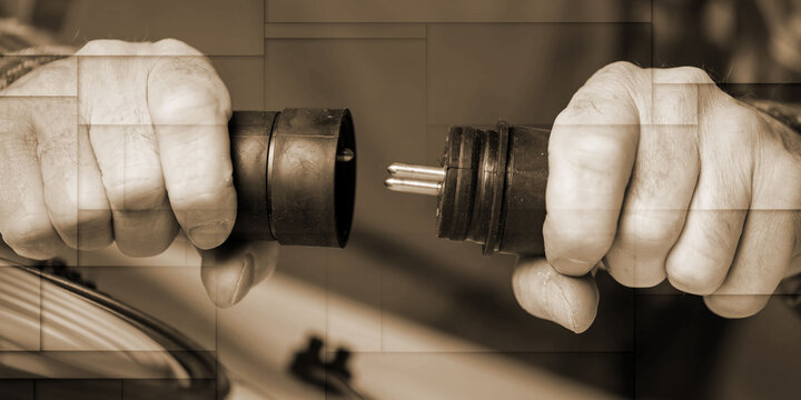 Close-up view of male hands plugging in cables. Cropped man connecting microphone to cable.