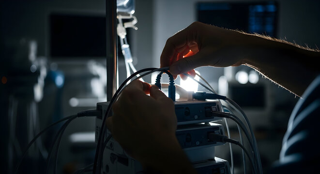 Hands Connecting Medical Equipment Wires Inside a Darkened Hospital Environment with Illuminated Monitors and Diagnostic Devices