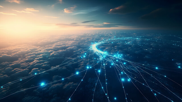 Ultra-realistic 8K HDR image of glowing fiber optic lines connecting continents over Earth’s surface, viewed from the stratosphere. Soft morning light enhances cinematic realism, with ample sky copysp