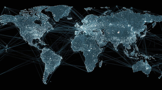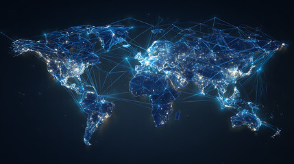 Vibrant digital world map glowing at night, showing illuminated continents and intricate networks, representing global connectivity, technology, and an interconnected future