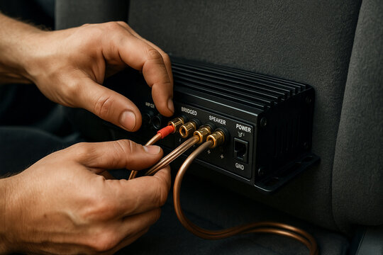 Close-up of a technician's gloved hands meticulously connecting and repairing intricate electrical wiring inside an electronic device or industrial...