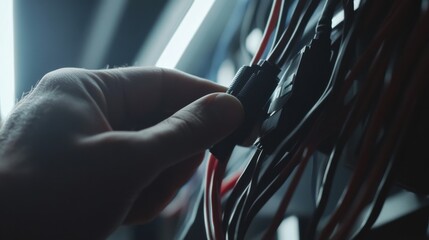 Electrician connecting wiring for a new security system in a building. Featuring security installation and wiring