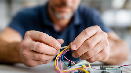 Faceless closeup of technician's hands working with colorful wires connecting them to device, electrical wiring work, circuit connection, cable assembly, defocused hands with wires