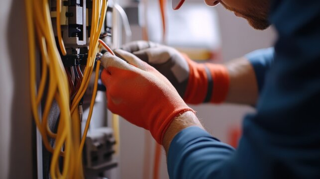 Electrician working on wires while installing a component on a smart home automation system. Selective focus