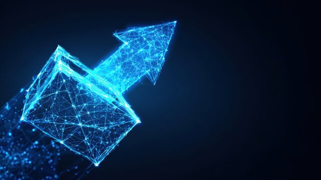 Abstract glowing blue arrow formed by digital network particles moving forward