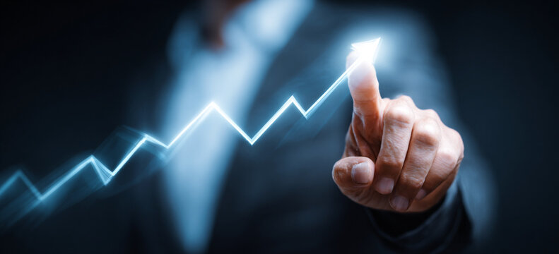 Businessman touching a glowing upward arrow graph symbolizing business growth, success, and financial progress