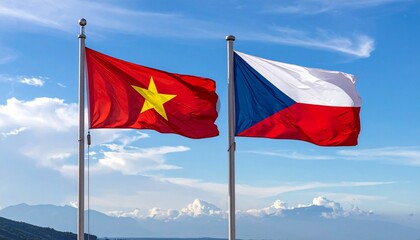 Czech Republic and Vietnam flags hoisted under blue sky with clouds, symbolizing diplomatic relationship and cultural connection.