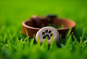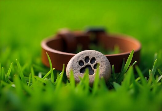 Heartfelt pet memorial scene with paw print stone and brown leather collar in gentle sunlight. Symbolic tribute expressing love, remembrance, peace, and emotional connection to a lost companion.