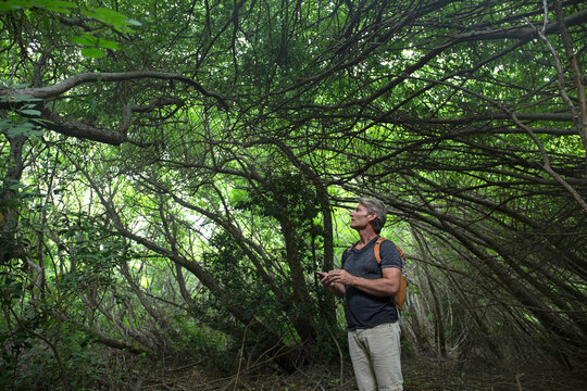 Hiker uses GPS to check directions in dense forest