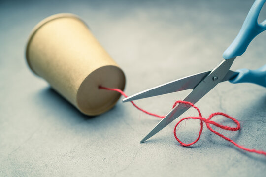 Closeup a scissors cutting the rope from the other end of a cup phone, lost contact, and signal, communication breakdown