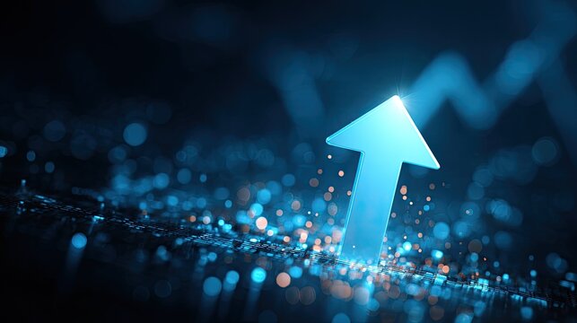 Upward arrow with digital bokeh, implying growth, success, advancement