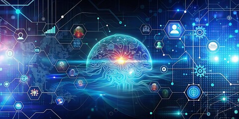 A glowing, intricate geodesic sphere composed of interconnected luminous nodes and lines, set against a dark, abstract background.