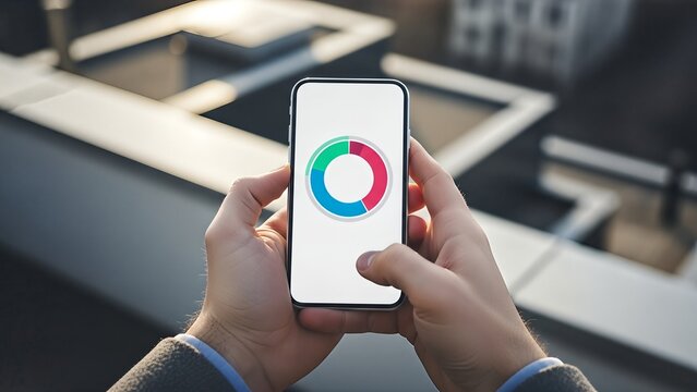 A person holds a smartphone displaying a colorful graph outdoors, suggesting business analysis.