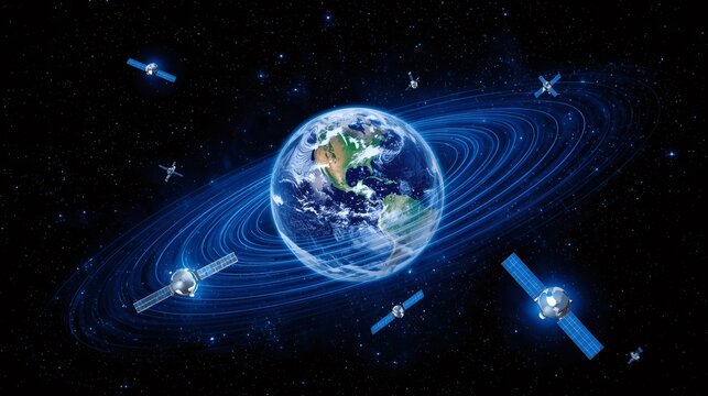 Vectore illustration of global network of glowing blue lights encircling the earth at night, representing connectivity and data transfer