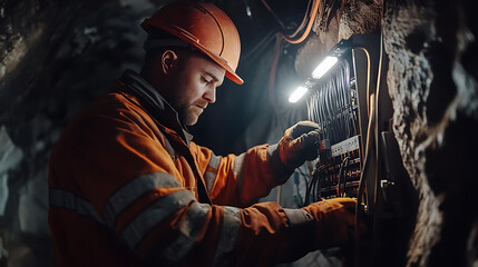 Underground mining electrician repairing control circuits in a tunnel. Featuring expertise and precision