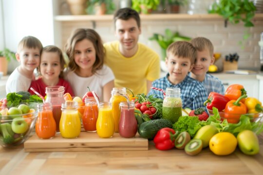 Joyful Family Enjoying a Healthy Meal with Fresh Fruits and Vegetables in a Bright Kitchen Setting