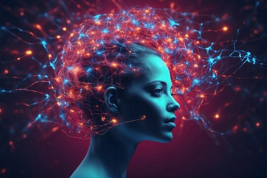 Neon cybernetic profile emitting neural circuitry and flowing data ribbon