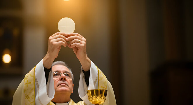 A priest performing a Eucharist during a religious service, holding the consecrated host up high.