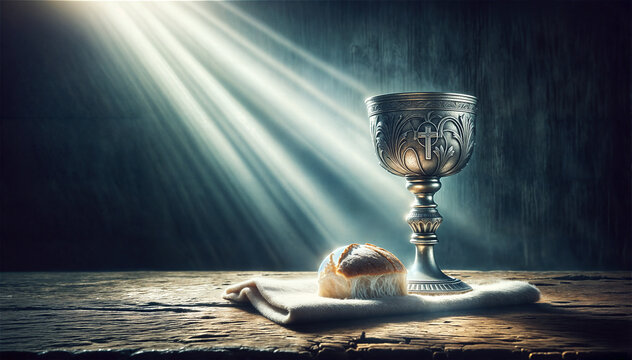 Golden chalice and loaf of bread on wooden table, illuminated by ethereal light beams. Symbolic still life concept of spirituality and nourishment.