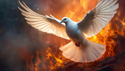 white dove, symbolizing the Holy Spirit, flies through the air amidst flames, set against a fiery red and orange background, representing purity, divine presence, and spiritual transformation