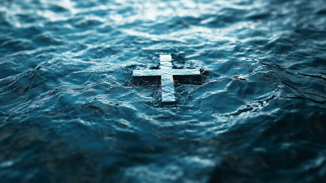 The image features a wooden cross gently drifting on calm water, illuminated by the midday sun. The serene surroundings evoke a sense of tranquility and contemplation.