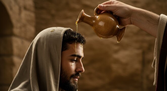 A man is anointed with holy oil from a clay jug in a biblical scene. Close-up of a religious ceremony representing faith, blessing, and consecration