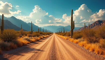 Desert road with saguaro cacti, mountains under blue cloudy sky. Arid landscape features dry grass, long dirt path leading to horizon. Scene suggests solitary journey through vast, natural expanse.