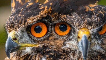 Close-up of sharp-eyed predatory owls with vibrant orange irises and focused gaze