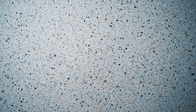 Terrazzo floor in top view. Seamless texture consistent throughout. New clean white bright and regularly. Small gray gravel mixed with mortar cement. Polished smooth for floor, wall or cladding.
