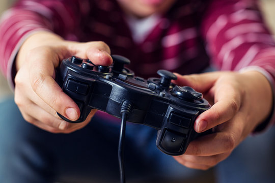 Video game controller on laptop, closeup