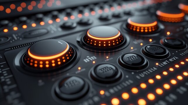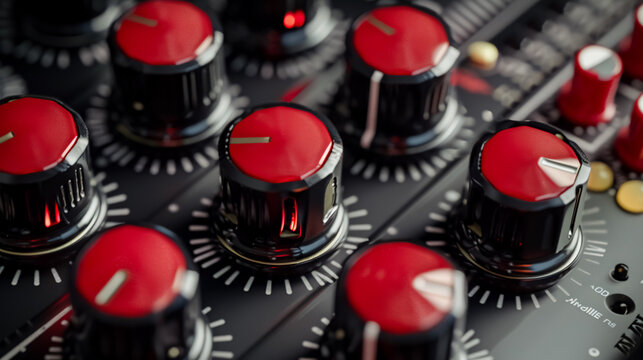 Audio adjusters and red buttons on a mixing console, used for modifying audio signals in recording studios, broadcasting, and television.