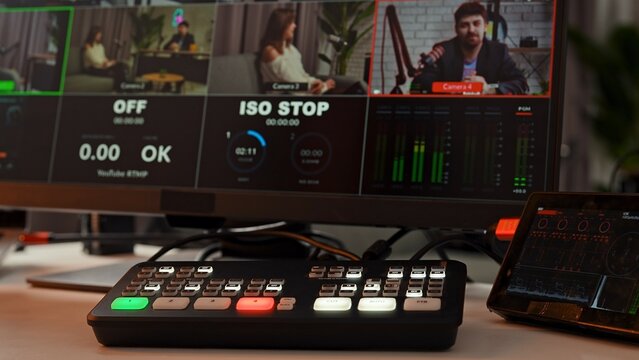 Friendly ai control console with smiling screen, analog faders, knobs and led indicators
