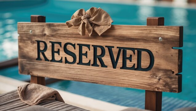Wooden reservation sign with text Reserved placed near swimming pool in a tranquil outdoor setting