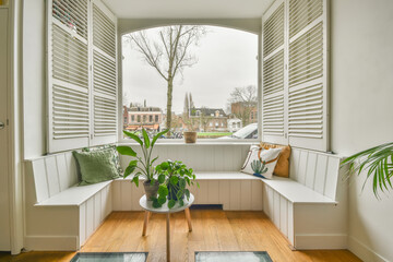 Wooden table near bay window seat with cushions in cozy room. Interior design