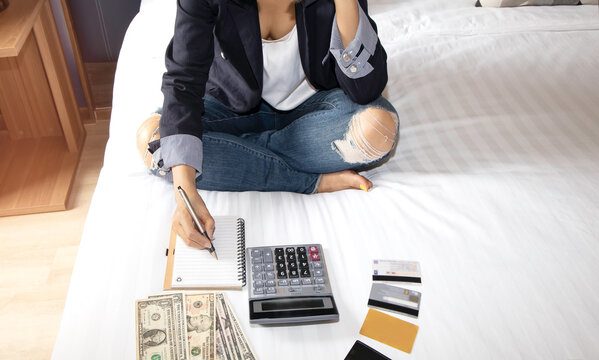 selective focus of woman hand with calculator  and credit cards which she is  unemployment and personal bankruptcy in the bed room