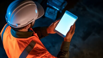 Construction worker views data on digital tablet professional uses digital device for on site analysis