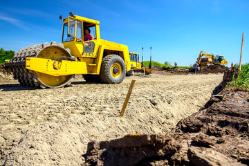 Construction roller leveling sandy ground at site