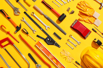 Mature carpenters collaborating in workshop aligning wooden board with digital icons overlay
