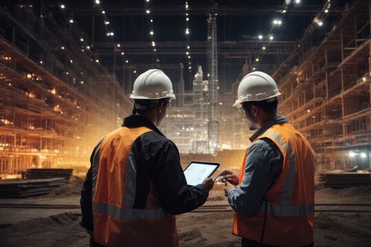 Construction Worker Analyzing Data On Digital Network Interface Images