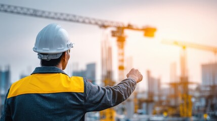 A construction worker in a hard hat oversees a building site with cranes in the background during sunset.