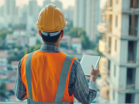 Construction worker using digital tablet for structural safety inspection on building site, modern technology.