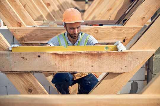 Construction Worker Using Level Tool At Building Site For Precision Work Images